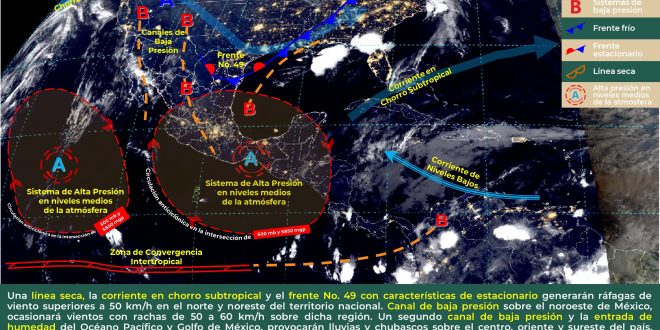 Se prevé que durante las próximas 24, tiempo estable en gran parte de la península de Yucatán, con nublados dispersos por entrada de humedad, probabilidad de lloviznas en el oriente de Yucatán, centro de Quintana Roo en el resto de la península no se prevén lluvias. Se esperan temperaturas muy calurosas a extremadamente calurosas durante el día y cálidas en la noche, mientras que el viento se mantendrá del sureste de 20 a 30 km/h y rachas de más de 50 km/h en las costas.