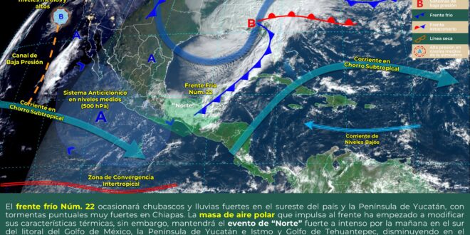 El paso del frente frio No. 22 sobre la península de Yucatán y su masa de aire frio estarán generando evento de norte con rachas superiores a 65 km/h, así como chubascos y lluvias fuertes en el norte, centro y noreste de Yucatán, sur y suroeste de Campeche, así como en gran
