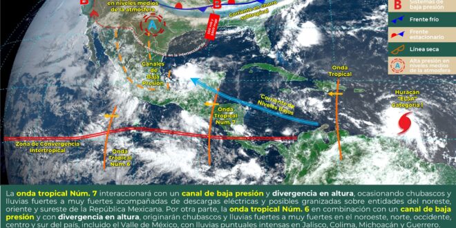 Se presentarán condiciones de cielo medio nublado a nublado en los tres estados de la región debido al paso de la onda tropical No.7, aunado a un canal de baja presión sobre el occidente del golfo de México, por lo que se esperan chubascos con tormentas dispersas a lo largo del estado de Quintana Roo, así como en el noreste, noroeste y sur de Yucatán, mientras que para el centro y sur de Campeche se prevén tormentas fuertes. Debido a la nubosidad predominante, se prevé que las temperaturas sean cálidas a calurosas durante el día y cálidas durante la noche, con viento del este-sureste de 15 a 25 km/h y rachas de 40 km/h en zonas costeras de los tres estados de la región.
