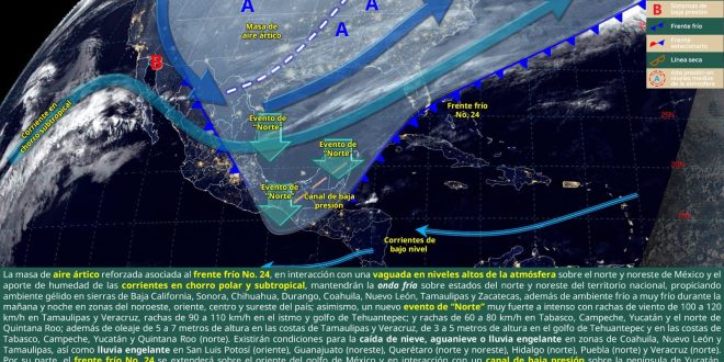 El frente frío No. 24 al oriente de la península de Yucatán y el reforzamiento de la masa de aire ártico que lo impulsa, asi como el ingreso de aire maritimo tropical