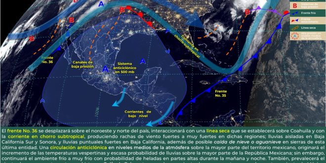 Yucatán, debido al dominio de un sistema anticiclónico en niveles medios de la atmósfera. El ambiente será cálido a caluroso en el día y fresco a templado al amanecer. Viento del este noreste de 15 a 25 km/h y rachas mayores a 40 km/h en zonas de costa.