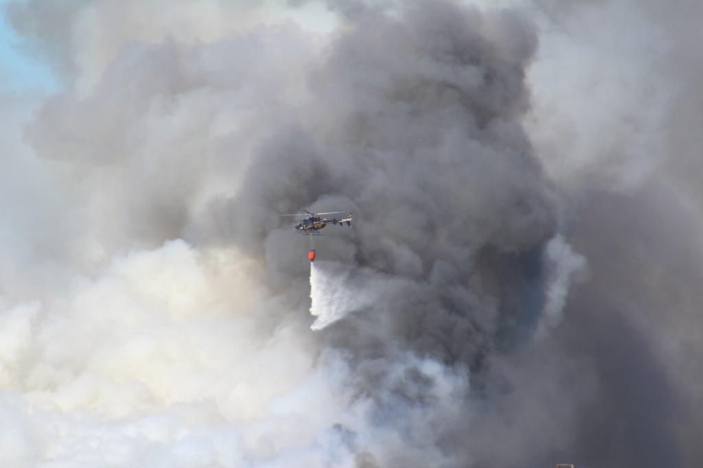 El helicóptero Bell-429 descarga agua sobre el fuego con el heli-balde cada carga es de 700 litros.