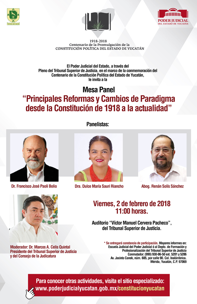 El Magistrado Ricardo de Jesús Ávila Heredia, coordinador de una serie de eventos que se han realizado desde el año pasado para conmemorar el Centenario de la Constitución de Yucatán, informó que en esta mesa panel participarán el Dr. Francisco José Paoli Bolio, la Dra. Dulce María Sauri Riancho y el Mtro. Renán Solís Sánchez moderados por el Magistrado Presidente del Tribunal Superior de Justicia y del Consejo de la Judicatura de Yucatán Dr. Marcos Alejandro Celis Quintal.