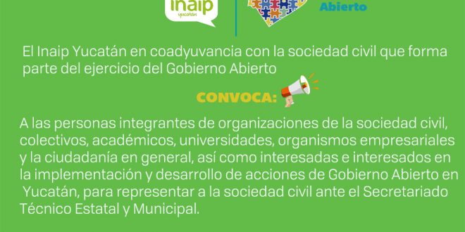 MÉRIDA, 26 de enero del 2020.- Personas integrantes de organizaciones de la sociedad civil, colectivos, universidades, académicas y académicos, organismos empresariales y la ciudadanía en general, así como las personas interesadas en la implementación y desarrollo de acciones de Gobierno Abierto en Yucatán, pueden participar en la convocatoria para representar a la sociedad civil ante el Secretariado Técnico Estatal y Municipal.