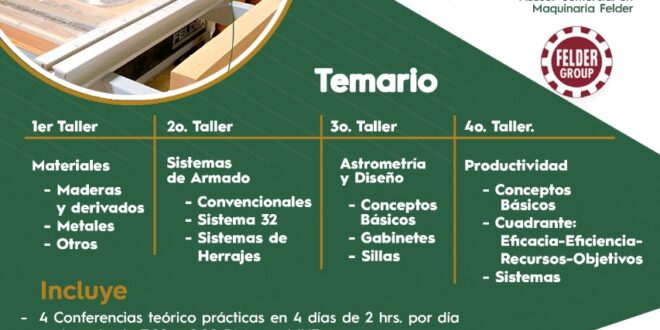 Mérida, Yucatán. -Con el compromiso de contribuir a la formación profesional de los asociados y del público en general interesado en este ramo de la actividad productiva en la región, el presidente de la Cámara Nacional de la Industria Maderera Delegación Sureste (CANAINMA), Edgardo Martínez Duarte, anunció que los días 11, 12 y 23 de enero próximo se llevará cabo el “Taller de Conferencias teórico-prácticas”, impartido por Claudio Ramos Gómez, Asesor Comercial en Maquinaria Felder.