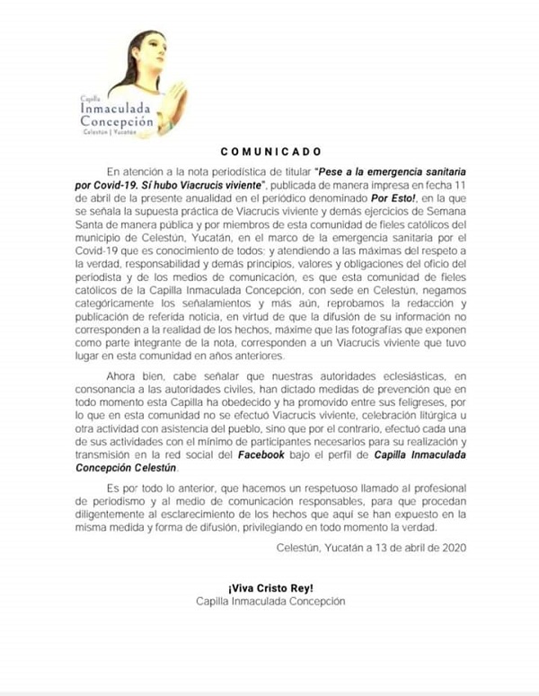 Al ser enterado del traspié del comunicador local, el presbítero Juan Martín Mendez Bojórquez informó ante la grey católica que es falsa esa noticia, y pidió una aclaración de ese rotativo. Como se sabe la representación viviente del Viacrucis no se hizo debido a la contingencia de la pandemia del coronavirus Covid-19, acatando la orden de la Arquidiócesis, la iglesia de la Purísima Concepción. Por lo cual la casa de Dios permaneció cerrada para cumplir de esta forma con las indicaciones sanitarias emitidas por las autoridades estatales y municipales.