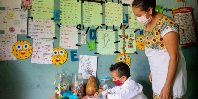 Tecoh, Yucatán, 8 de junio de 2021.- Con la ayuda de su mamá, Arturo señala las vocales, repite cada una y platica orgulloso cómo aprendió a escribir su nombre o, incluso, recados para sus familiares; va en tercero de preescolar y, durante esta pandemia, ha logrado avances importantes en su formación académica, gracias a una idea que incluyó decoración, creatividad y dedicación.
