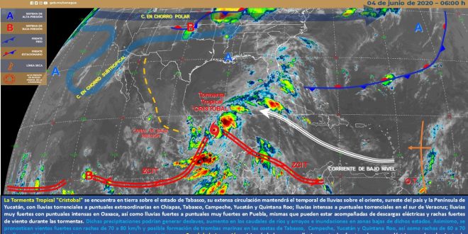 Esta mañana la tormenta tropical Cristóbal se localizó a 95 km al SE de Cd. Del Carmen, Campeche, presenta vientos sostenidos de 65 km/h y rachas de 85 km/h. Las bandas nubosas asociadas a este sistema, siguen ocasionando lluvias en gran parte de la región, observándose el desarrollo de tormentas en el noreste, centro y sur de la península de Yucatán.