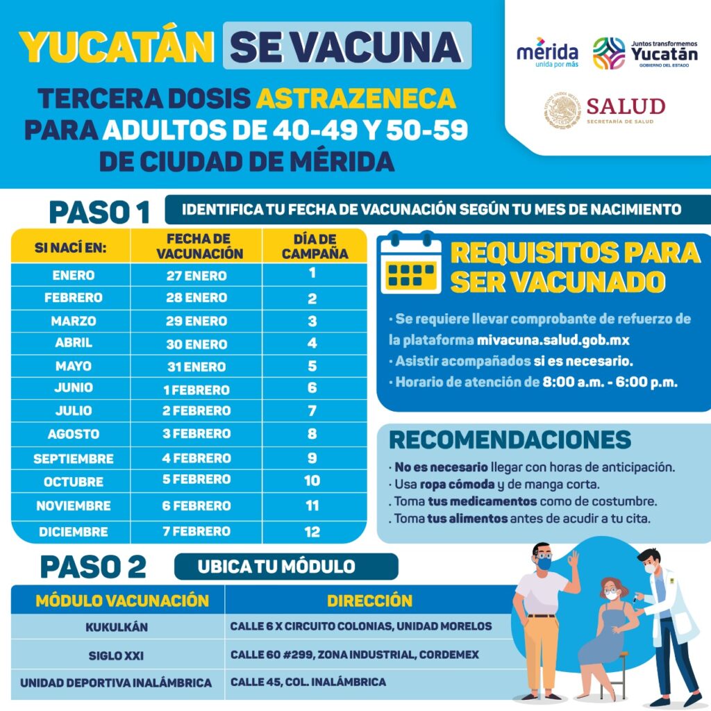 Del jueves 27 de enero al lunes 7 de febrero, se aplicará la vacuna de refuerzo contra el Coronavirus a personas de entre 40 y 59 años de Mérida
