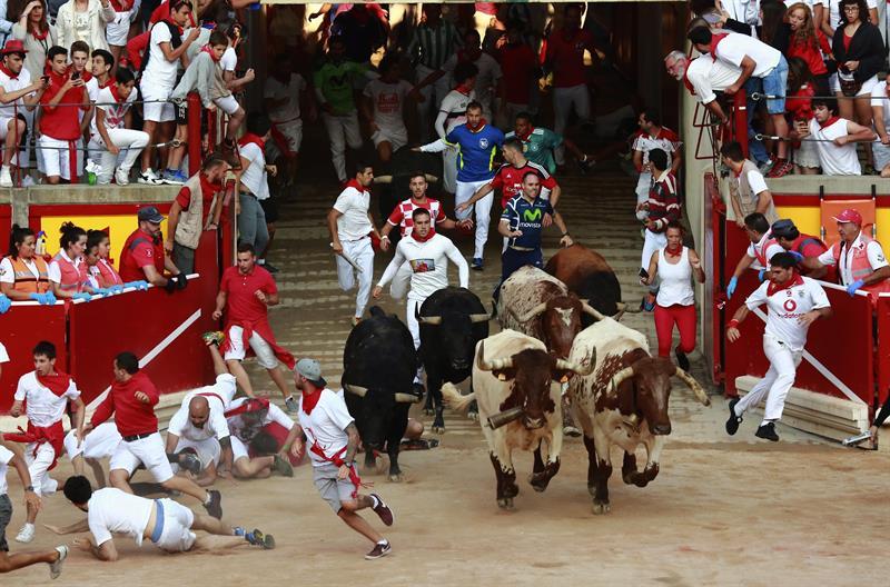 La manada ha corrido agrupada y a fuerte ritmo, para llegar a la plaza en dos minutos y 15 segundos, rodeados de una multitud de mozos que han acompañado su carrera, algunos de ellos tocando el lomo de los animales, pese a estar prohibido.