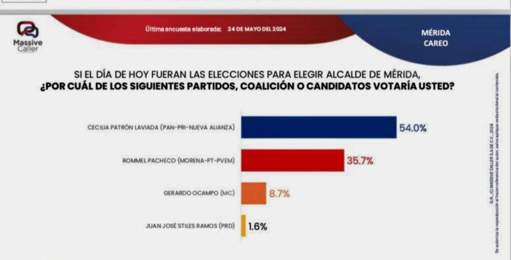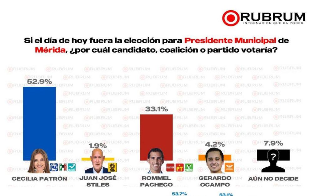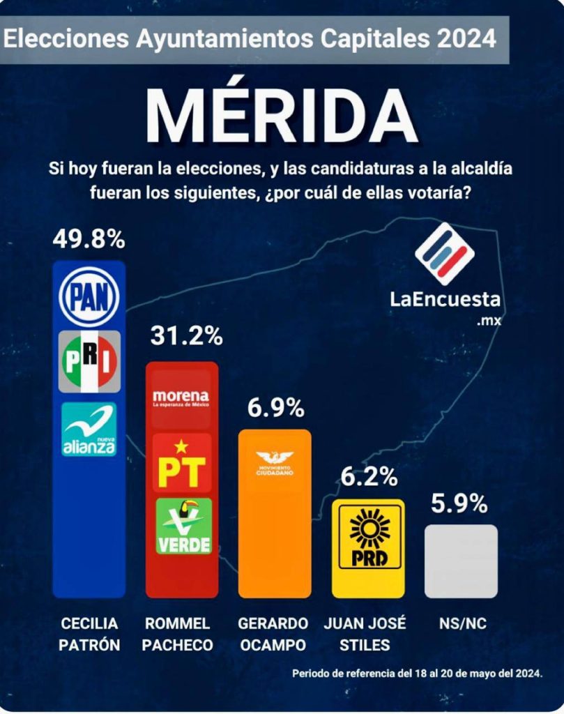 Con respecto a los demás candidatos en la contienda, la ventaja de Cecilia Patrón -la única candidata mujer que compite por la alcaldía de Mérida- es aún más amplia, entre 42.9 y 52.4 puntos sobre Gerardo Ocampo Castro, candidato de Movimiento Ciudadano, y Juan José Stiles Ramos, candidato del PRD, quienes aparecen muy abajo en las encuestas.