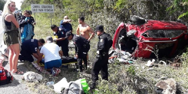 VALLADOLID, Yuc., 13 de noviembre de 2019.-  Cuatro lesionados, entre ellos dos menores de edad, fue el saldo de la aparatosa volcadura de una camioneta, en la que viajaban igual número de visitantes extranjeros.