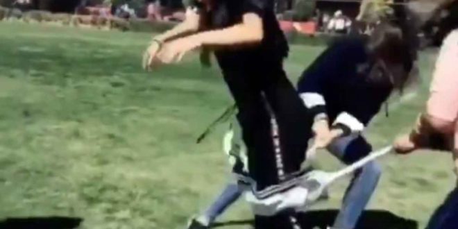 En las imágenes se observa que mientras la víctima es distraída por otra chica, dos compañeras llegan por detrás y con una sudadera la hacen caer al suelo hacia el frente.