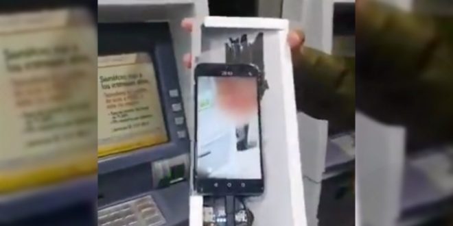 Una vez que logra desmontar el aparato, denuncia que el celular se quedó grabando 28 minutos en un cajero de la sucursal de Avenida Gustavo Baz Prada.