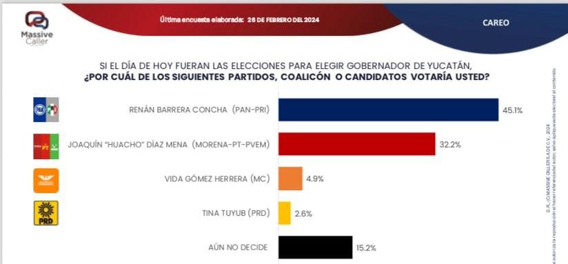 MÉRIDA, Yuc., 27 de febrero 2024.- De acuerdo con la más reciente encuesta de intención de voto realizada por Massive Caller, Renán Barrera Concha, candidato del PAN, PRI y PANAL ocupa el primer lugar con un 45.1% de preferencia electoral, mientras que en segundo lugar se encuentra Huacho Díaz Mena, candidato de Morena, PT y PVEM, con un 32.2%.