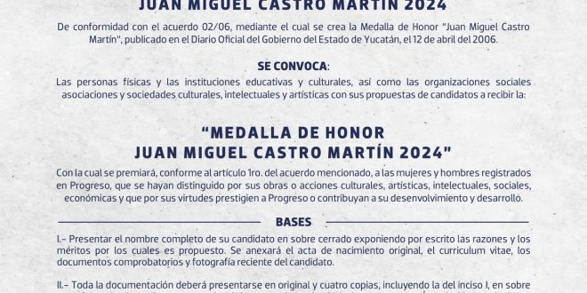 El lunes 01 de julio del presente año, la ciudad y puerto de Progreso cumplirá 153 años de su fundación, y como es tradición, ese día será entregada la medalla de honor “Juan Miguel Castro Martín” a aquella mujer u hombre registrados en Progreso que se hayan distinguido por sus obras o acciones culturales, artísticas, intelectuales, sociales, económicas que contribuyan al municipio.
