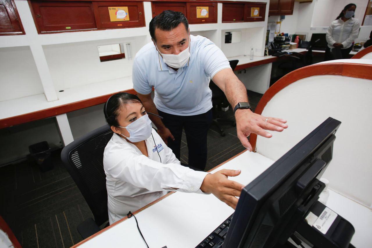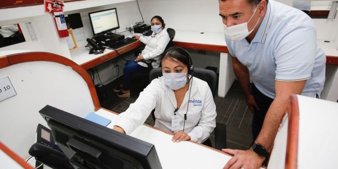 Acompañado de Eira Pólito García y Marcos Pech Naal, directora de la Unidad de Atención Ciudadana y jefe del Instituto Municipal para el Fortalecimiento de la Cultura Maya, respectivamente, Barrera Concha visitó las instalaciones de Ayuntatel donde constató el servicio que se ofrece a la ciudadanía mayahablante de colonias y comisarías del municipio.