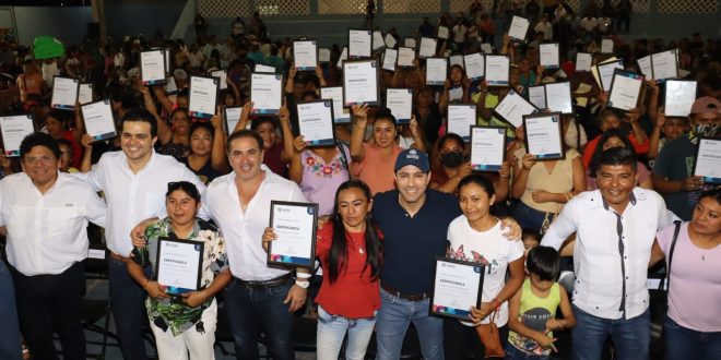 Posteriormente, autoridades se trasladaron a la conocida cancha techada del Flamboyanes para hacer entrega de certificados de vivienda a 205 familias.