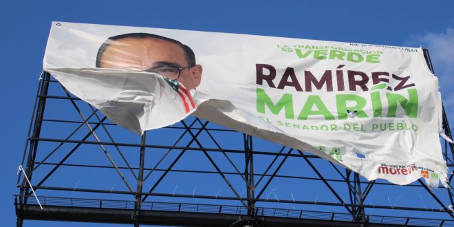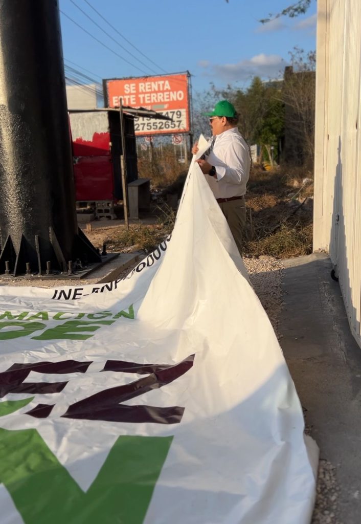 Mérida, Yucatán, 25 de marzo de 2024.- El candidato a senador por la 4T, Jorge Carlos Ramírez Marín, denunció el daño causado a la publicidad electoral colocada en un espectacular de la carretera Mérida-Motul, la cual fue la única afectada de las numerosas propagandas que hay a lo largo de esta vía.