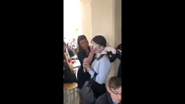 La grabación comienza cuando unas chicas guían a una joven, a quien le tapan los ojos, por el pasillo de un comedor escolar.