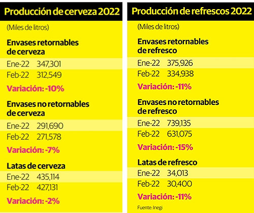 El refresco en sus diferentes presentaciones también presentó una caída. La producción de esta bebida en envases retornables cayó un 11 por ciento de enero a febrero del 2022, mientras que la del refresco en botella no retornable bajó en un 15 por ciento y la manufactura de refrescos en lata disminuyó en ese lapso en un 11 por ciento.