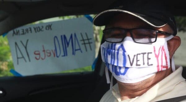 También en algunos de los cubrebocas de los participantes se leen mensajes contrarios al Presidente.