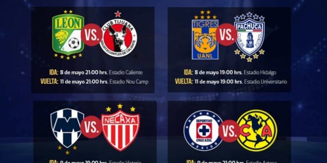 La liguilla dará inicio oficialmente en el estadio Hidalgo el 8 de mayo a las 19:00 horas, cuando Pachuca recibe a Tigres y dos horas más tarde, en el estadio Caliente, Xolos tratará de sacar ventaja como local cuando reciba al León que llega como líder del torneo regular.
