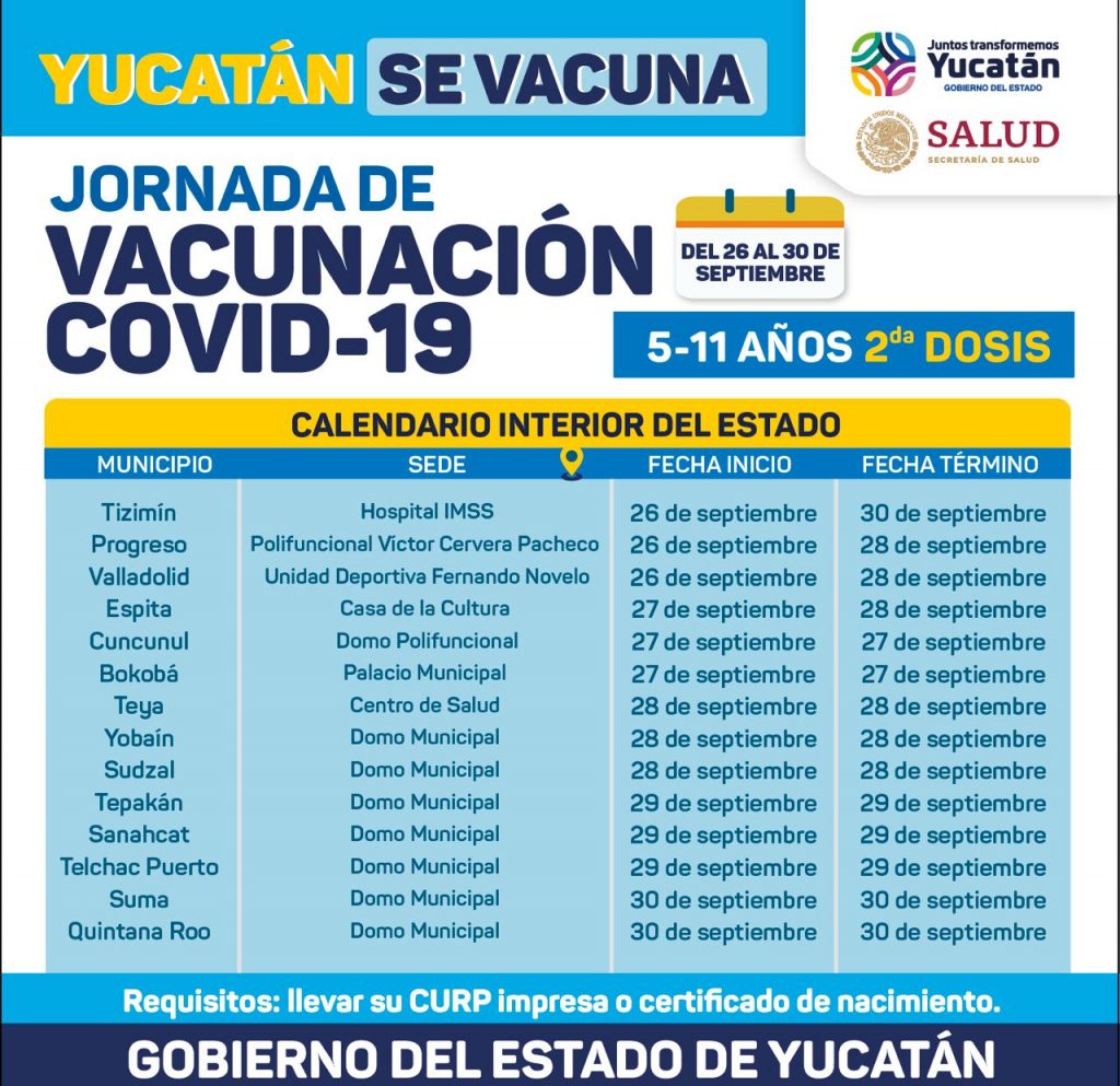 La dependencia subrayó que, en esta nueva etapa, se brindará el fármaco Pfizer pediátrico a infantes que viven en Tizimín, Progreso, Valladolid, Espita, Cuncunul, Bokobá, Teya, Yobaín, Sudzal, Tepakán, Sanahcat, Telchac Puerto, Suma y Quintana Roo; de acuerdo con lo programado, las jornadas se llevarán a cabo de la siguiente forma: