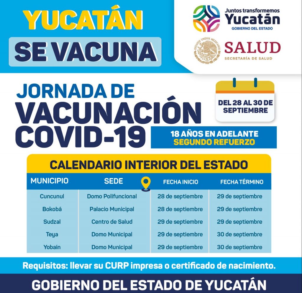 Las dosis de refuerzo para personas de 18 años en adelante, que no cuenten con su esquema de vacunación completo, se aplicarán del 28 al 29 de este mes, en Cuncunul y Bokobá; 29 y 30, para Teya y Yobaín, y únicamente el 29, en Sudzal.
