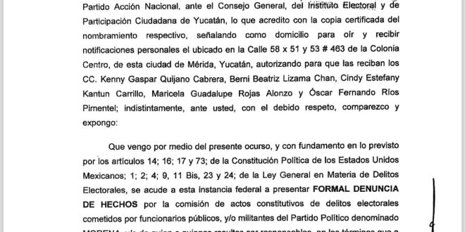 MÉRIDA, Yuc., 24 de mayo 2024.- Tal y como se anunció, el PAN Yucatán presentó este día una denuncia ante la Fiscalía General de la República en contra del partido Morena, funcionarios federales de Bienestar Yucatán y el candidato a gobernador del partido guinda, por presuntos uso indebido de recursos públicos y de programas sociales para la obtención del voto.