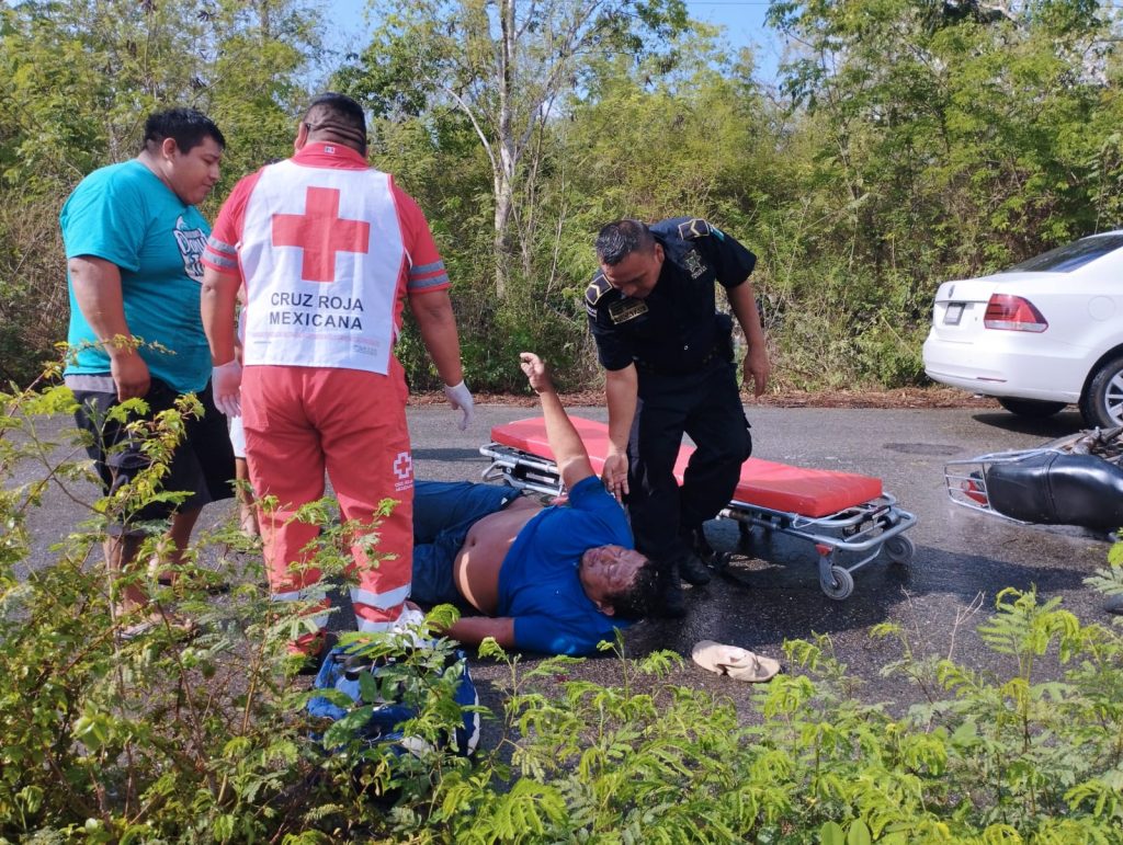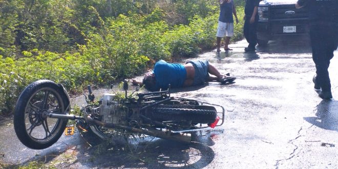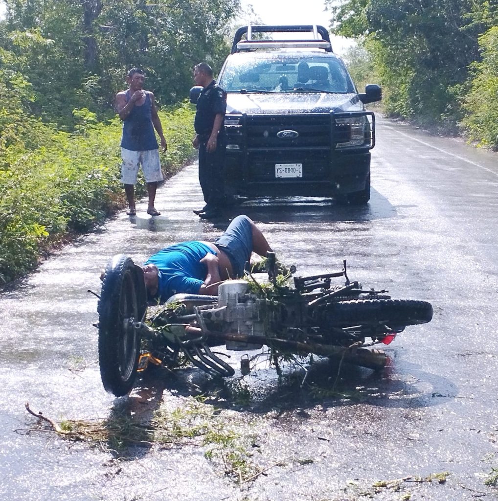 Kinchil, Yuc., a 4 de julio.- El señor Manuel Jesús T. C., (a) “Fito” de 49 años de edad y su amigo de parranda, tuvieron una dura derrapada a bordo de su motocicleta en el tramo que une este pueblo con Samahil, la tarde lluviosa de este domingo.
