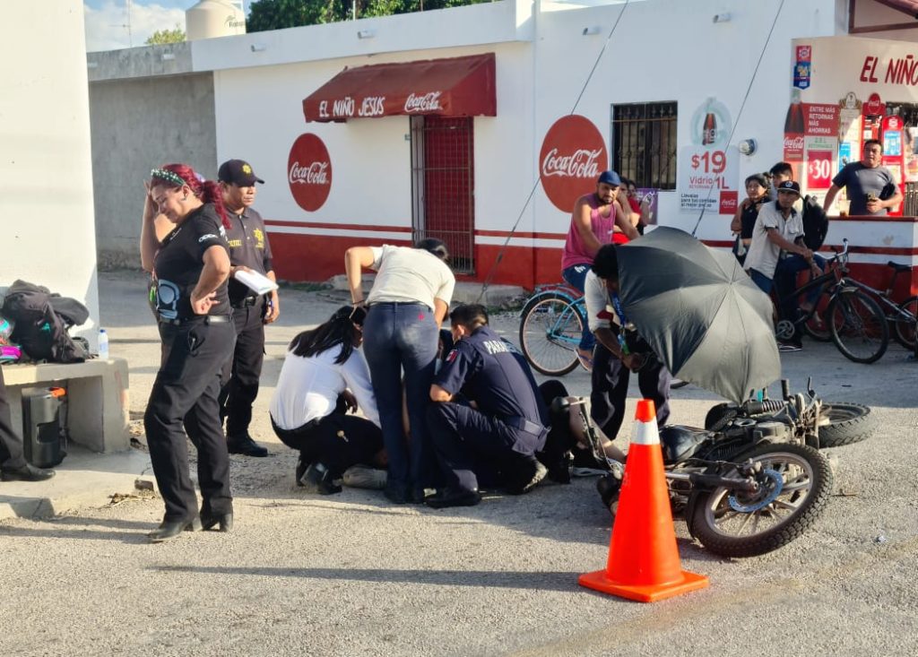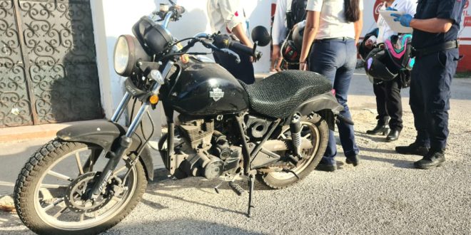 Circulaban de sur a norte sobre la 20, cuando un ‘malix pek’ salió de golpe de la esquina con cruce 25, para así perder el equilibrio del caballo de acero la guiadora. Llevando la peor parte Lupe, al quejarse de fuertes dolores en el pie derecho, mientras era atendida por paramédicos de la ambulancia Y-35 de la SSP.