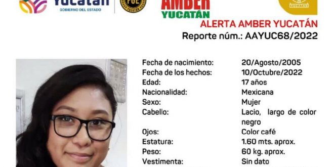 MÉRIDA, Yuc., 18 de octubre 2022.- La Fiscalía General del Estado (FGE) de Yucatán activó la Alerta Amber para solicitar el apoyo de la comunidad a fin de dar con el paradero de la joven Natalia Daniela Cetina Carrillo, de 17 años de edad, quien desapareció en Mérida.