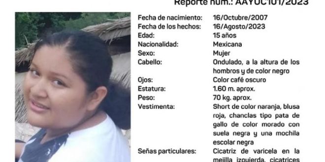 De acuerdo con el reporte AAYUC101/2023, la joven fue vista por última vez el 16 de agosto en la localidad de Santa Rita, del municipio de Temozón, sin que hasta el momento se tenga información de su paradero.