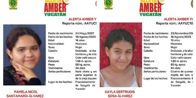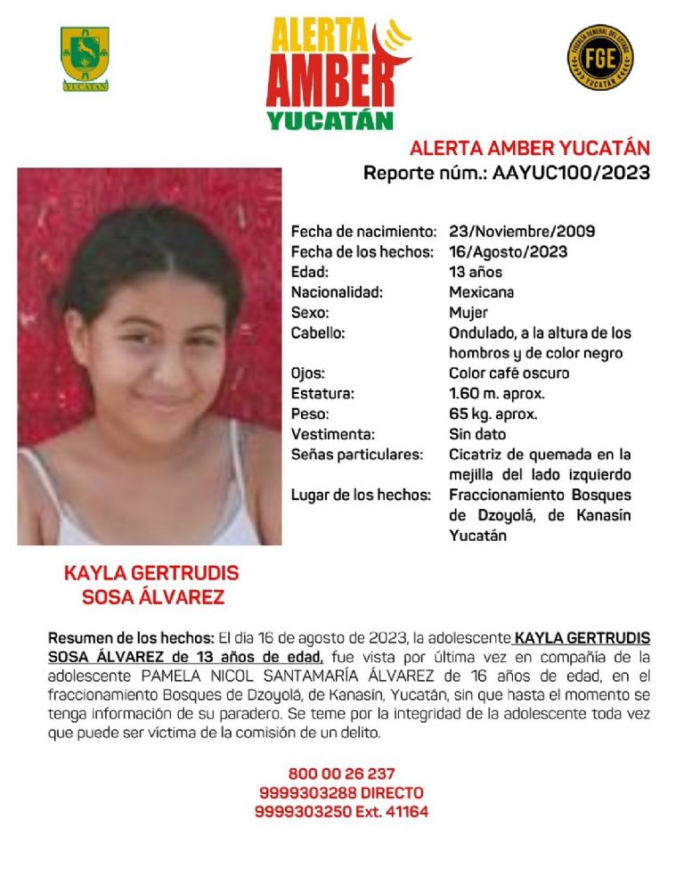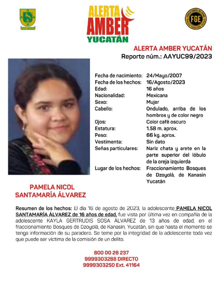 KANASÍN, Yuc., 18 de agosto 2023.- La Fiscalía General del Estado activó la Alerta Amber Yucatán para pedir el apoyo de la población para dar con el paradero de las adolescentes Pamela Nicol Santamaría Álvarez y Kayla Gertrudis Sosa Álvarez, de 16 y 13 años de edad, respectivamente, quienes desaparecieron en Kanasín.