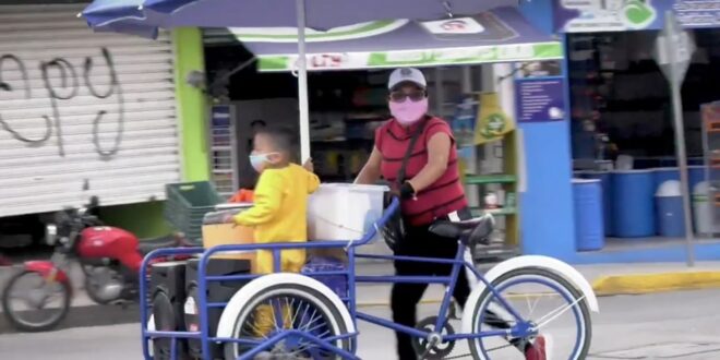 Paula de 36 años de edad también se vio obligada a sacar a su hijo de la estancia infantil entonces de Sedesol. Ahora recorre las calles de Puebla en su triciclo con su hijo de tres años al lado de los botes de nieve.
