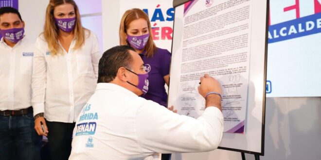 Mérida, 31 de mayo de 2021. Al participar en la firma del Acuerdo de Igualdad Paridad y No Violencia contra las Mujeres por razón de género, impulsado por el Colectivo 50+1, el candidato del PAN a la Presidencia Municipal, Renán Barrera Concha, aseguró que su administración enfocará sus esfuerzos al empoderamiento de la mujer y continuará priorizando la erradicación de todo tipo de violencia contra mujeres y niñas.