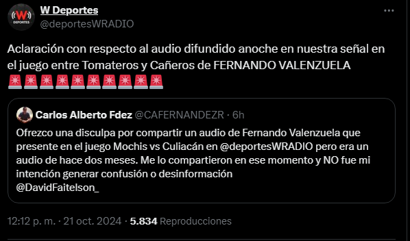 “Ofrezco una disculpa por compartir un audio de Fernando Valenzuela que presente en el juego Mochis vs Culiacán en @deportesWRADIO pero era un audio de hace dos meses. Me lo compartieron en ese momento y NO fue mi intención generar confusión o desinformación”.