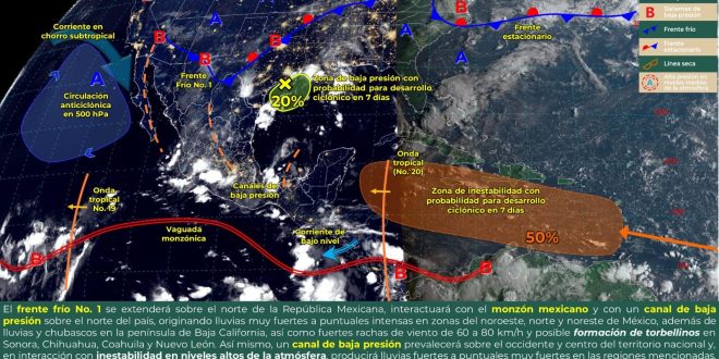 El desplazamiento de la onda tropical núm. 20 aproximándose a la región, y la inestabilidad en niveles superiores de la tropósfera, favorecerán tormentas puntuales fuertes en el oriente y sur de Yucatán, centro y sur de Campeche, así como en centro de Quintana Roo. Además, el ambiente se tornará caluroso a muy caluroso en el día y cálido al amanecer, con viento de componente este-sureste cambiando al noreste y noroeste dejando rachas de 40 km/h.