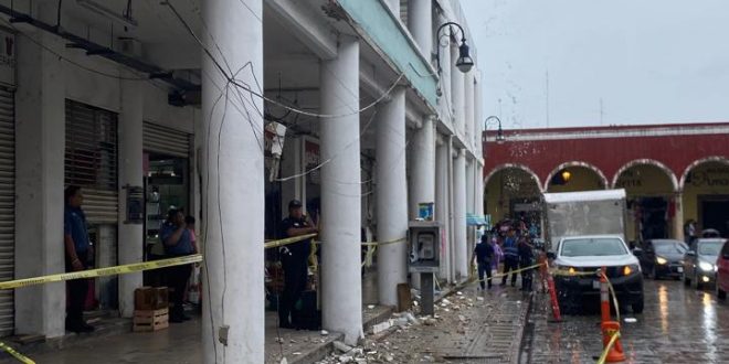 Mérida, Yucatán, sábado 28 de 2025.- El mercado Lucas de Gálvez presentó desprendimiento de una parte de cornisa de la fachada, por lo que se retiró a los vendedores ubicados en el área.
