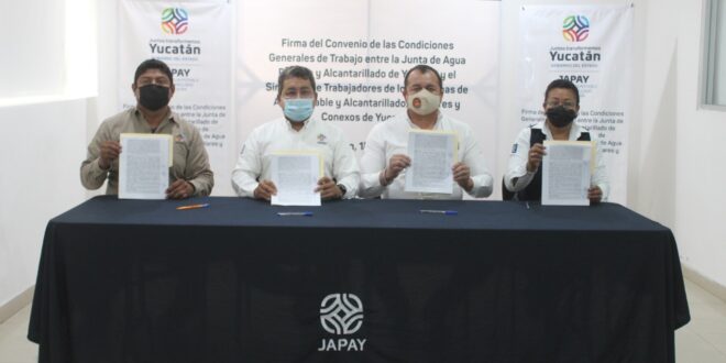 Mérida, Yucatán, 18 de enero de 2022.- Con el convenio que signaron este día la Junta de Agua Potable y Alcantarillado (Japay) y el Sindicato de Trabajadores de los Sistemas de Agua Potable y Alcantarillado, Similares y Conexos (STSAPASCY), se establecen las condiciones generales de trabajo entre la dependencia y los agremiados.