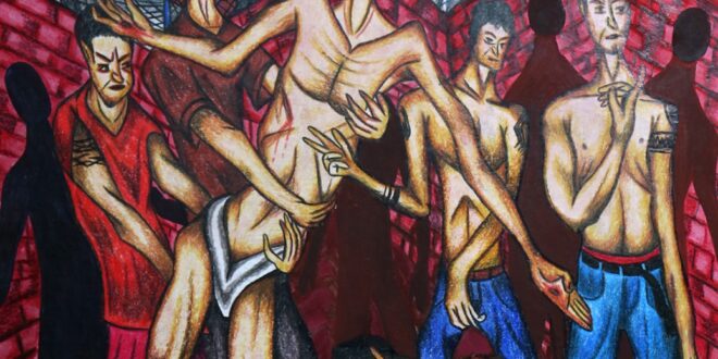 En su obra, titulada “El Cristo”, Adolfo plasmó a un grupo de personas privadas de su libertad, bajando al Salvador de la cruz, teniendo como fondo las torres de concreto y los muros que separan el Cereso de la calle, como mudos testigos del momento; es un cuadro lleno de tonos intensos y contrastes, en técnica mixta de acuarelas y lápices de colores.