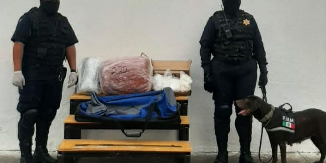 Mérida, Yucatán a 11 de junio de 2022.- La oportuna intervención de los agentes pertenecientes a la Unidad Canina de la Policía Municipal de Mérida permitió la detección de más de 6 kilos de marihuana y 2 kilos de piedra conocida como “crack”.