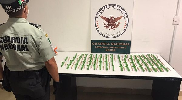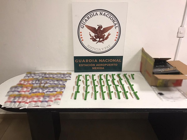 MÉRIDA, Yuc., 31 de agosto 2020.- En dos acciones de inspección y vigilancia para evitar actos posiblemente constitutivos de delito, integrantes de la Guardia Nacional detectaron en el hangar de paquetería del Aeropuerto Internacional Mérida, bolsas que contenían cigarros en cartuchos de plástico y cigarros de tabaco en envoltorios. Al aplicarles pruebas presuntivas, dieron positivo a marihuana.