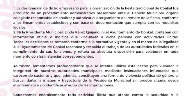 Asimismo, la administración conkaleña lamentó que este suceso se haya intentado utilizar para desprestigiar a las autoridades locales, denunciando que dichas acciones constituyen una forma de violencia política de género al buscar dañar la imagen de la alcaldesa sin fundamento alguno.