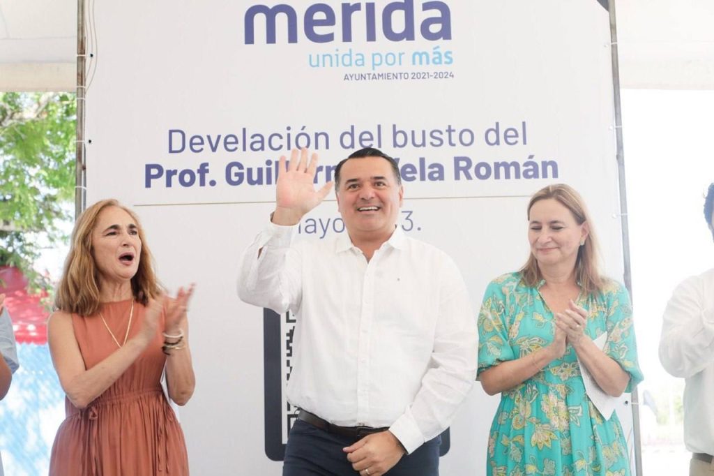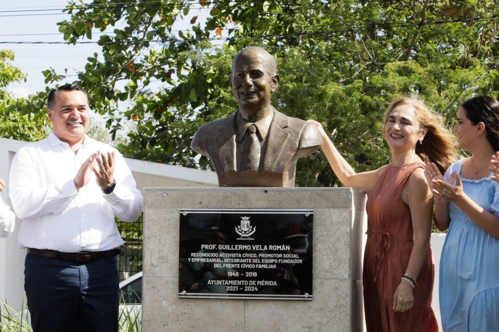 En el marco del evento que se realizó en presencia de Patricia Monforte Méndez, esposa del homenajeado, sus hijos, Guillermo, Gerardo, Patricia y Gabriel Vela Monforte, el Primer Edil inauguró la glorieta que se ubica sobre la Avenida Temozón Norte por calle 40 diagonal, en la comisaría del mismo nombre.