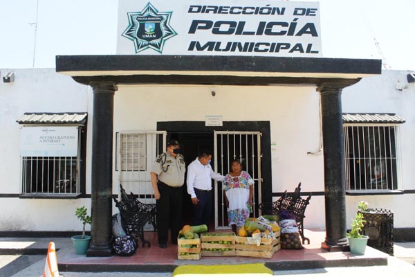 UMÁN, Yuc., 10 de abril 2020.- Con mucho gusto, el alcalde de Umán, Freddy Ruz Guzmán le hizo entrega de su mercancía a doña Candita Carrillo, quien lo recibió con gran alegría ya que nunca creyó que recuperaría sus frutas y verduras que cosechó durante varias semanas.