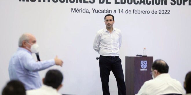 Mérida, Yucatán, 14 de febrero de 2022.- El Gobernador Mauricio Vila Dosal sostuvo un encuentro con rectores y directores de universidades públicas y privadas del estado, donde abordó temas relacionados con el regreso seguro a clases, el panorama actual de la pandemia en la entidad y la prevención y atención de la violencia contra las mujeres u otros grupos en situación vulnerable dentro del ámbito escolar.
