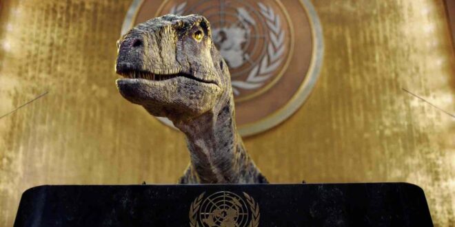 La ONU echó mano este miércoles de la experiencia de los dinosaurios con una original campaña de crisis climática en la que, gracias a los avances de la tecnología, uno de estos animales invadió virtualmente el hemiciclo de la Asamblea General para expresar su estupefacción por el hecho de que los humanos se estén extinguiendo a sí mismos.