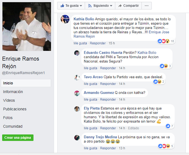 Y es que la diputada Bolio Pinelo es la encargada de coordinar a mujeres para la campaña del candidato presidencial y la gubernatura de Yucatán, Ricardo Anaya y Mauricio Vila, respectivamente, le escribió en el Facebook de Ramos Rejón que va en coalición con el PRI en estos comicios electorales, “amigo querido, el mayor de los éxitos, se todo lo que tienes en el corazón para entregar a Tizimín, espero que tus conciudadanos sepan decidir por lo mejor para Tizimín…. un abrazo hasta la tierra de Reinas y Reyes…!!! Enrique Jose Ramos Rejon”